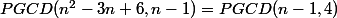 Le PGCD est 4 si 4 divise (n-1) donc si n-1=4k soit n=4k+1 (