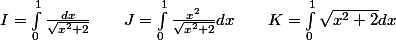 I=intégral de0à1 dx/racine(x²+2); J=intégral de 0à1 (x²)/ racine(x²+2)dx et K=intégral de 0à1 racine(x²+2)