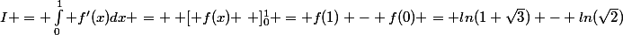Donc on vient de trouver une dérivée de la fonction f, et on s'aperçoit que I est l'intégrale de 0 à 1 de f '