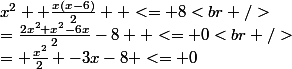 }{2} <= 8<br />\\=\frac{2x^2+x^2-6x}{2}-8 <= 0<br />\\= \frac{x^2}{2} -3x-8 <= 0)