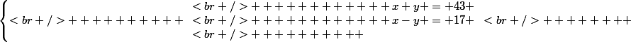 x-y=17 (qui est donné dans l'énoncé). Donc: (43-y)-y=17, et tu continues à remplacer les objets par d'autres qui signifient la même chose: 43-2y=17 43-2y-43=17-43 -2x=-26 -2x.(-1)=-26.(-1) 2x=26 2x/2=26/2 x=13