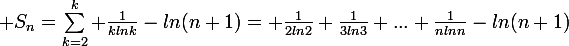 = \frac{1}{2ln2}+\frac{1}{3ln3}+...+\frac{1}{nlnn}-ln(n+1))