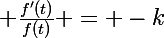 " A l'instant t=0 , on injecte dans le sang d'un patient une dose de 3ml d'un médicament. Une étude du processus d'élimination de ce médicament a permis d'observer qu'a chaque instant t, exprimé en heures. la vitesse d'élimination de ce produit est proportionelle à la quantité f(t) exprimée en ml, de ce médicament encore présent dans le sang du patient c'est à dire qu'il existe une constante strictement positive k telle que :