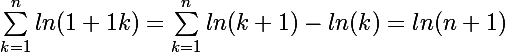 =\sum_{k=1}^nln(k+1)-ln(k)=ln(n+1))
