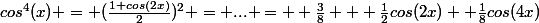 = (\frac{1+cos(2x)}{2})^2 = ... = \frac{3}{8} + \frac{1}{2}cos(2x) +\frac{1}{8}cos(4x))