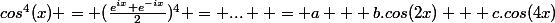 = (\frac{e^{ix}+e^{-ix}}{2})^4 = ... = a + b.cos(2x) + c.cos(4x))