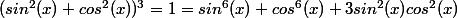 (sinx)^6+3((sinx)^4(cosx)^2+(cosx)^4(sinx)^2)+(cosx)^6+1 et une autre avec la même égalité mais pas écrit de la même façon et pour simplifier ma deuxième expression le prof nous a dit de nous aider de ce qu'on a fait