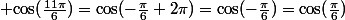 =cos(-\frac{\pi}{6}+2\pi)=cos(-\frac{\pi}{6})=cos(\frac{\pi}{6}))