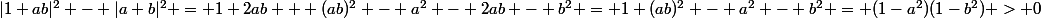 ^2 - a^2 - 2ab - b^2 = 1+(ab)^2 - a^2 - b^2 = (1-a^2)(1-b^2) > 0)