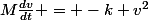M(dv/dt)= -k v² (projection de l'équation vectorielle sur l'axe du mvment)