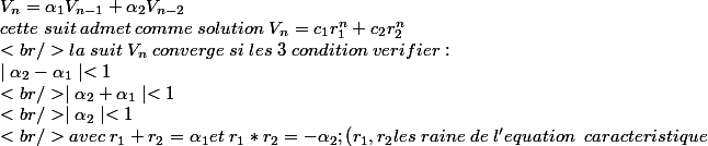 (et en plus c'est faux : une suite (Vn)_n vérifiant pour tout entier n une formule de récurrence de la forme V(n)=a.V(n-1)+b.V(n-2) n'est pas forcément de la forme V(n)=c1.r1^n+c2.r2^n. Par exemple V(n)=n vérifie V(n)=2.V(n-1)-V(n-2) )