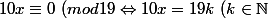 19 divise 10 x et 19 est premier avec 10 donc d'après le théorème de Gauss, 10 divise x soit
