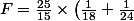 F =25/15 x (1/18 +1/24 ) je sais qu'il faut dabord calculer les parenthèses mais avec le 18 et24 au dénominateur je bloque je pense que ça fait pour les parenthèse 1/42 est ce ça???si vous pouvez me répondre ça serait sympat