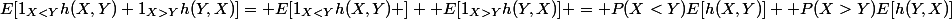 +1_{X>Y}h(Y,X)]= E[1_{X<Y}h(X,Y) ]+ E[{1_{X>Y}h(Y,X)] = P(X<Y)E[h(X,Y)] +P(X>Y)E[h(Y,X)])