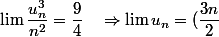 Il n' y as d'équivalence, je suis partie de votre écrit (u_n^3)/n^2= 9/4 que j'ai écrit en Latex et j'ai fait les étapes décrites dans mon poste. rappel : 3^2=9 \quad et \quad 2^2=4 je vous redonne le calcul. \dfrac{u_n^3}{n^2}= \dfrac94 \quad \Rightarrow \quad u_n^3= \dfrac94 n^2 \quad \Rightarrow ...