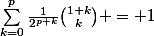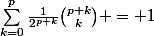 Bonsoir, j'aimerais de l'aide afin de pouvoir faire ce calcul. Merci de m'aider ÉNONCÉ Soient p et q deux entiers positifs, démontrer que : \sum_{k=0}^{q}{\frac{1}{2^p^+^k}}\binom{p+k}{k} + \sum_{k=0}^{p}{\frac{1}{2^{q+k}}}\binom{q+k}{k} = 2 je dois donner ce que j'ai fait mais je ne vois pas encore...