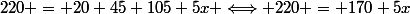 bonjour merci de m'aider pour mon fils. un fleuriste dispose de 220 roses. il décide d'en vendre 20 à l'unité, de faire 5 bouquets de 9 roses,15 bouquets de7 roses et des bouquets de 5 roses. écris en une seule expression qui permet de calculer le nombre de bouquets de 5 roses. calcule ce nombre en ...