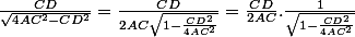 Je ne sait pas s'il y a des questions stupides mais je sens que j'en déterre une :help: Est t-il possible d'exprimer cette fraction : \frac{CD}{\sqrt{4AC^{2}-CD^{2}} en AC/CD ? J'ai commencé à décomposer mais je ne vois pas comment cela pourrait aider ... \frac{CD}{\sqrt{(2AC-CD)(2AC+CD&...