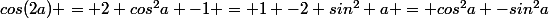 = 2 cos^2a -1 = 1 -2 sin^2 a = cos^2a -sin^2a)