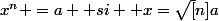 salut avec a=4 et n=2, l'équation est x²=4 et il y a deux solutions ( 2 et -2) avec a=8 et n=3, l'équation est x³=8 et il y a une solution (2) avec a=-8 et n=3, l'équation est x³=-8 et il y a une solution (-2) avec a=-8 et n=2, l'équation est x²=-8 et il y n'y a pas de solution et ce que votre répo...