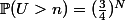 =\mathbb{P}(n-1\quad\textrm{interventions a l'heure PUIS une intervention en retard})=(\frac{3}{4})^{n-1}\frac{1}{4})