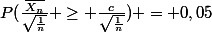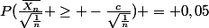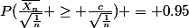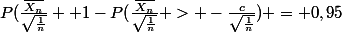 [quote="Ben314"]Dans ce cas tu utilise la symétrie de la courbe qui te dit que p(Xa)=1-p(X P(\frac{\bar{X_n}}{\sqrt{\frac{1}{n}}} 1-P(\frac{\bar{X_n}}{\sqrt{\frac{1}{n}}} < \frac{c}{\sqrt{\frac{1}{n}}}) = 0,95