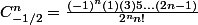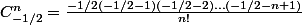 (-1/2-2)\ldots(-1/2-n+1)}{n!}<br /><br /><br />C_{-1/2}^{n}=\frac{(-1)^{n}1/2(1/2+1)(1/2+2)\ldots(1/2+n+1)}{n!}<br /><br />C_{-1/2}^{n}=\frac{(-1)^{n}(1)(3)5\ldots(2n-1)}{2^{n}n!})