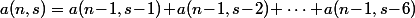 =a(n\!-\!1,s\!-\!1)\!+\!a(n\!-\!1,s\!-\!2)\!+\cdots+\!a(n\!-\!1,s\!-\!6))