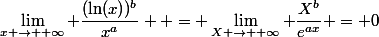 )^b}{x^a} = \lim\limits_{X \rightarrow +\infty} \dfrac{X^b}{e^{ax}} = 0)