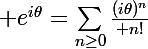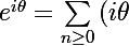 ^n\over n!}=\sum\limits_{n\geq0}{(i\theta)^{4n}\over (4n)!}+\sum\limits_{n\geq0}{(i\theta)^{4n+1}\over (4n+1)!}+\sum\limits_{n\geq0}{{(i\theta)^{4n+2}} \over (4n+2)!}+\sum\limits_{n\geq0}{{(i\theta)^{4n+3}} \over (4n+3)!}\\<br />=\sum\limits_{n\geq0}{\theta^{4n}\over (4n)!}+i\sum\limits_{n\geq0}{\theta^{4n+1}\over (4n+1)!}+(-1)\sum\limits_{n\geq0}{{\theta^{4n+2}} \over (4n+2)!}+i(-1)\sum\limits_{n\geq0}{{\theta^{4n+3}} \over (4n+3)!}\\<br />=\sum\limits_{k\geq0}(-1)^{2k}\ .{\theta^{2k}\over (2k)!}+i\sum\limits_{k\geq0}(-1)^{2k+1}\ .{\theta^{2k+1}\over (2k+1)!}+\sum\limits_{k\geq -1}(-1)^{2(k+1)+1}\ .{{\theta^{2(k+1)+1}} \over (2(k+1)+1)!}+i\sum\limits_{k\geq -1}(-1)^{2(k+1)+1}\ .{{\theta^{2(k+1)+1}} \over (2(k+1)+1)!}\\<br />=\bigg(\sum\limits_{k\geq0}(-1)^{2k}\ .{\theta^{2k}\over (2k)!}+\sum\limits_{k\geq -1}(-1)^{2(k+1)+1}\ .{{\theta^{2(k+1)}} \over (2(k+1))!}\bigg)+i\bigg(\sum\limits_{k\geq0}(-1)^{2(k+1)}\ .{\theta^{2k+1}\over (2k+1)!}+\sum\limits_{k\geq -1}(-1)^{2(k+1)+1}\ .{{\theta^{2(k+1)+1}} \over (2(k+1)+1)!}\bigg)\\<br />=\bigg(\sum\limits_{n\geq0}(-1)^{2n}\ .{\theta^{2n}\over (2n)!}+\sum\limits_{n\geq0}(-1)^{2n+1}\ .{{\theta^{2n}} \over (2n)!}\bigg)+i\bigg(\sum\limits_{n\geq0}(-1)^{2n}\ .{\theta^{2n+1}\over (2n+1)!}+\sum\limits_{n\geq0}(-1)^{2n+1}\ .{{\theta^{2n+1}} \over (2n+1)!}\bigg)\\<br />=\sum\limits_{n\geq0}(-1)^n {\theta^{2n}\over (2n)!}+i\sum\limits_{n\geq0}(-1)^n {\theta^{2n+1}\over (2n+1)!}\\<br />=cos(\theta)+isin(\theta))