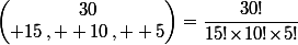 1) Tes 30 balles, il faut commencer par regarder le nombre de façons de les scinder en trois groupes, l'un de 15 balles, un deuxième de 10 balles et un troisième de 5 balles.