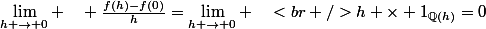 -f(0)}{h}=\lim_{h \rightarrow 0} \quad<br />h \times 1_{{\mathbb{Q}}(h)}=0)
