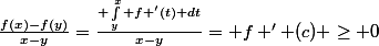 -f(y)}{x-y}=\frac{ \int_{y}^{x} f '(t) dt}{x-y}= f ' (c) \geq 0)