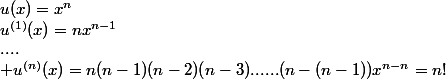 =x^{n}\\u^{(1)}(x)=nx^{n-1}\\....\\ u^{(n)}(x)=n(n-1)(n-2)(n-3)......(n-(n-1))x^{n-n}=n!)