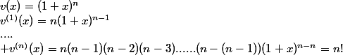 =(1+x)^{n}\\v^{(1)}(x)=n(1+x)^{n-1}\\....\\ v^{(n)}(x)=n(n-1)(n-2)(n-3)......(n-(n-1))(1+x)^{n-n}=n!)