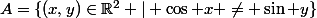 D'accord merci, donc pour dessiner A je dois prendre les éléments de la boule qui sont en communs avec cos x différent de sin y. Donc : Les éléments qui ne sont pas sur les droites mais autour en fait. Chaque intérieur de "carré".