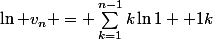 &=\sum_{k=1}^{n-1}k\ln(k+1)-\sum_{j=1}^{n-1}j\ln j\\<br />&= \sum_{j=2}^n(j-1)\ln j-\sum_{j=2}^{n-1}j\ln j\\<br />&= (n-1)\ln n-\sum_{j=2}^{n-1}\ln j\\<br />&= \ln\(\fr{n^{n-1}}{(n-1)!}\)\\<br />&=\ln \(\fr{n^n}{n!}\)<br />\end{align})
