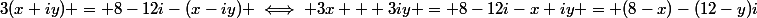 = 8-12i-(x-iy) \iff 3x + 3iy = 8-12i-x+iy = (8-x)-(12-y)i)