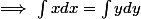 et on intègre de chaque côté. A gauche par rapport à x car on a dx et à droite par rapport à y car on a du dy, peu importe si y est une fonction de x.