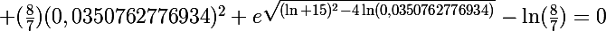 (0,0350762776934)^2 e^{\sqrt{(\ln 15)^2-4\ln(0,0350762776934)}}-\ln(\frac{8}{7})=0)