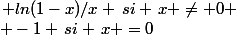 La raison de se phénomène est que, lorsque y est proche de 1, ln(y) est proche de y-1 et donc, lorsque x est proche de 0, f(x) est proche de ((1-x)-1)/x). Algébriquement, cette expression vaut -1. Ceci n'est pas vrai en arithmétique machine car l'addition machine n'est pas associative.