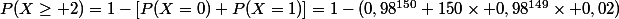 =1-[P(X=0)+P(X=1)]=1-(0,98^{150}+150\times 0,98^{149}\times 0,02))