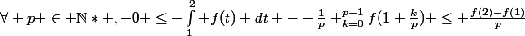 que pour tout nombre entier naturel non nul p, 0<=intf(t)dt de 1 à 2 -(1/p)sumf(1+k/p)