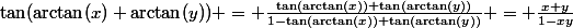 +\arctan(y)) = \frac{\tan(\arctan(x))+\tan(\arctan(y))}{1-\tan(\arctan(x)) \tan(\arctan(y))} = \frac{x+y}{1-xy})