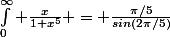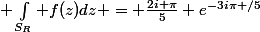 =\int_{\gamma_3} \frac {z}{1+z^5}\,dz = \int_R^{0} \frac{e^{\frac{2i\pi}{5}}x}{1+\big(e^{\frac{2i\pi}{5}}x\big)^5}\,e^{\frac{2i\pi}{5}}\, dx=\cdots)