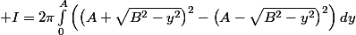 \displaystyle I=2\pi\int_0^A\Big(\big(A+\sqrt{B^2-y^2}\big)^2-\big(A-\sqrt{B^2-y^2}\big)^2\Big)\,dy