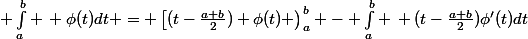 dt = \left[(t-\frac{a+b}{2}) \phi(t) \right)_{a}^{b} - \int_{a}^{b} \, (t-\frac{a+b}{2})\phi'(t)dt)