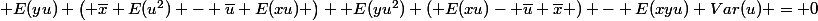 -\bar{u}^2 & \quad E(xu)-\bar{x}\bar{u} \\<br />\displaystyle E(yu^2)-\bar{u}E(yu) & \quad E(xyu)-\bar{x}E(yu) <br />\end{array} = 0)