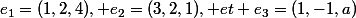 , e_2=(3,2,1), et e_3=(1,-1,a))