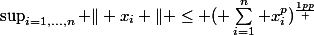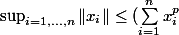 ^{p} = x_{r}^{p} \leq x_{1}^{p} + ... + x_{r}^{p} + ... + x_{n}^{p} \hspace{10cm} \Longrightarrow \hspace{10cm} \sup_{i=1,...,n} \| x_{i} \| \leq (\displaystyle \sum_{i=1}^{n} x_{i}^{p})^{\frac{1}{p}} $)